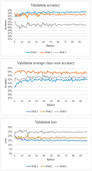 Overall, the validation accuracy ranged from 88.6% to 94.7%. Validation average class-wise accuracy ranged from 89.9% to 94.4%. The validation loss ranged from 0.143 to 0.269 (Figure 3).