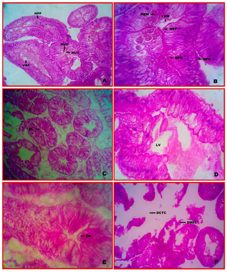 Cytopathological alterations of hepatopancreas in E. tetragonum. A paraffin slice stained with hematoxylin and eosin (40×) under the light microscope: (A,B)—control, (C)—after 7 days of exposure to chlorpyrifos at a dosage of 0.0294 ppm, (D)—after 28 days of exposure to chlorpyrifos at a dosage of 0.0294 ppm, (E)—after 7 days of exposure to chlorpyrifos at 0.0588 ppm, (F)—after 28 days of exposure to chlorpyrifos at 0.0588 ppm. Abbreviations used: HPF—F-cells, NUC—nucleus, NUU—nucleolus, VAC—vacuole, LUM—lumen, MEF—myoepithelial cells associated fibres, MFN—myoepithelial cells prominent nuclei, HPR—R cells, DL—distended lumen, LV—large vacuole, DCTC—damaged connective tissue layer, DN—disappearance of the nucleus, DMEL—damaged myoepithelial layer.