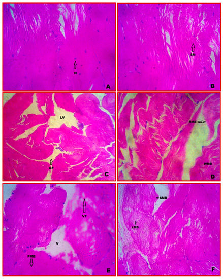 Cytopathological alterations of muscle in E. tetragonum. A paraffin slice stained with hematoxylin and eosin (40×) under the light microscope: (A,B)—control, (C)—after 7 days of exposure to chlorpyrifos at a dosage of 0.0294 ppm, (D)—after 28 days of exposure to chlorpyrifos at a dosage of 0.0294 ppm, (E)—after 7 days of exposure to chlorpyrifos at 0.0588 ppm, (F)—after 28 days of exposure to 0.0588 ppm chlorpyrifos concentration. Abbreviations used: SM—striated muscle, N—nuclei, LV—large vacuole, GF—gap formation, RMB—rupture of muscle bundle, WMB—wavy of muscle bundle, VF—vacuole formation, V—vacuole, FMB—fusion of muscle bundle, SMB—shortening of muscle bundle, LMB—loosen of muscle bundle.