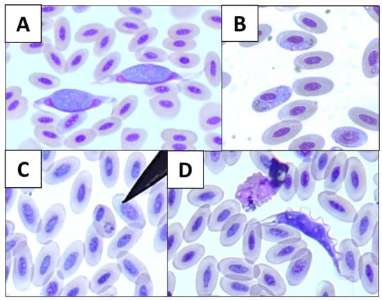 Microscopical photographs of blood parasite genera from wild birds at 1000×: (A) Leucocytozoon; (B) Haemoproteus; (C) Plasmodium; and (D) Trypanosoma.