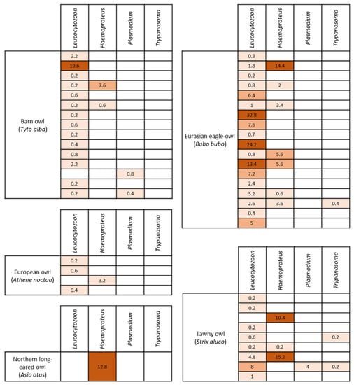 In our study, the presence of blood parasites seems to vary among bird species. The Eurasian eagle-owl and tawny owl are the species with higher percentage of parasitized individuals with a 94.7% and 90% positivity, respectively. Similar results had been obtained in these species previously [9,32,34,37]. Moreover, species from the genus Bubo seem to have a great affinity to some genera of hemoparasites, namely Leucocytozoon and Haemoproteus; however, the co-evolution of species has favored an immunological adaptation [38]. The lowest prevalence of blood parasites was detected in barn owls, which agrees with the findings of Ishak et al. [4].