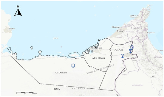 Map showing the location of the four PPRV infected farms in Al Ain region (Farms 2, 3 and 4) and Al Dhafra region (Farm 1), Abu Dhabi Emirate, UAE.