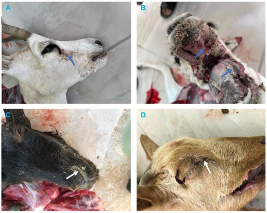 Clinical findings of peste des petits ruminants (PPR) in Dama Gazelle and Goats. (A) Dama Gazelle, showing ocular discharges (blue arrow). (B) Dama Gazelle, mouth lesions showing erosion on the buccal cavity, gums, and dental pad with whitish covering materials (blue arrows). (C) Goat, showing mucopurulent nasal discharges (white arrow). (D) Goat, showing conjunctivitis with purulent ocular discharges, the hair below the eyes matting together the eyelids (white arrow).