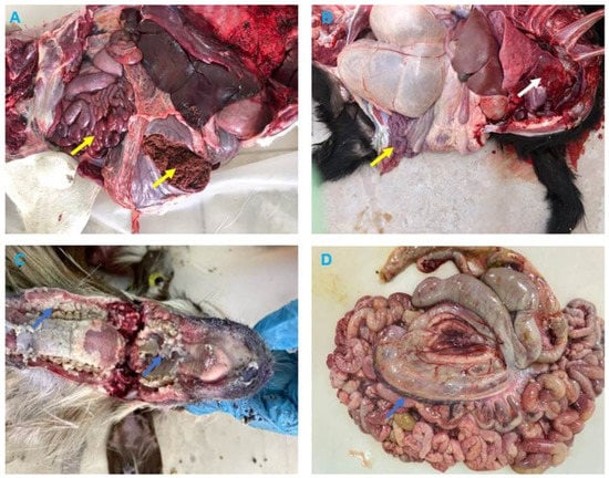 Necropsy findings in Dama Gazelle and Goats with Peste des petits ruminants (PPR). (A) Dama Gazelle digestive system shows hemorrhagic gastroenteritis (yellow arrows). (B) Goat, lung, showing bronchopneumonia, with consolidation in the middle and apical lobes of the right lung (white arrow), intestine with hemorrhagic enteritis (yellow arrow). (C) Goat, showing erosion on the buccal cavity, gums, and dental pad with whitish covering materials (blue arrows). (D) Goat, showing enlarged congested and edematous mesenteric lymph nodes (blue arrow).