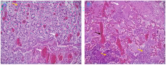 Microscopic lesions of PPR in a Goat. (A) Intestine section showing hemorrhagic enteritis with vascular changes (white arrows) and infiltration of inflammatory cells (yellow arrow). (B) Lung section showing acute hemorrhagic pneumonia with vascular changes including edema (white arrow), congestion (black arrow) and infiltration of inflammatory cells (yellow arrows). H&E stain, 20×.