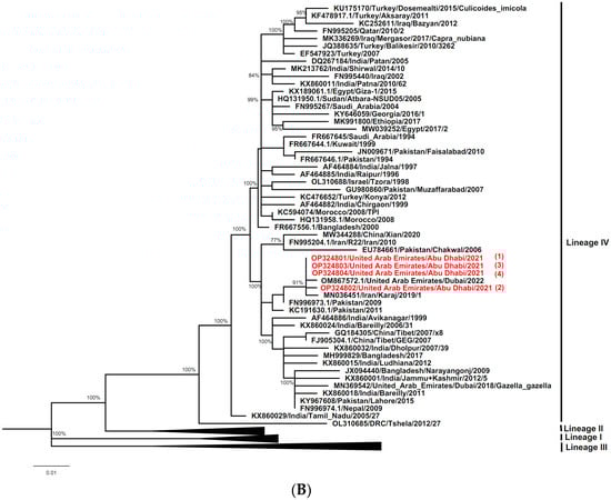 Separate phylogenetic trees were constructed using either N gene or F gene sequences of the UAE PPRV strains characterized here (ADAFSA_PPRV1_2021, ADAFSA_PPRV2_2021, ADAFSA_PPRV3_2021 and ADAFSA_PPRV4_2021), and their corresponding curated sequences mentioned in the method section. All UAE-PPRV strains from goats and dama gazelle studied here, were located within the Asian Lineage IV, close to PPRV from United Arab Emirates (GenBank: OM867572.1), Pakistan (GenBank: KC191635) and Tajikistan (GenBank: DQ840198.1) based on N gene sequence analysis and close to PPRV isolated from United Arab Emirates (GenBank: OM867572.1), Iran (GenBank: MN036451) and Pakistan (GenBank: KC191630 and FN996973.1) based on F gene sequence analysis as shown in Figure 5A,B for N gene and F genes respectively.