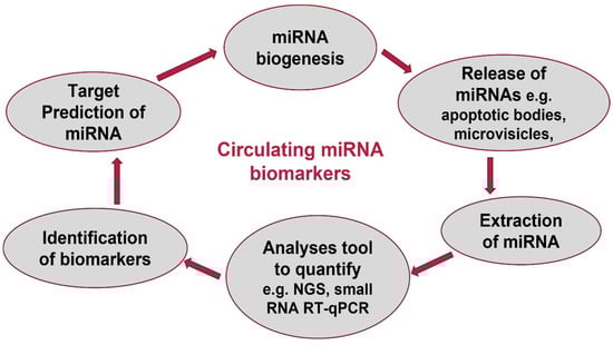 Circulating miRNAs have been utilized as biomarkers for a variety of diseases and physiological conditions in mice and humans [100,101,102,103,104]; research on domestic animals, particularly ruminants, is limited. The discovery of deregulated miRNAs and their targets opens the possibility of developing therapeutic, prognostic, and diagnostic approaches for veterinary diseases. MiRNAs are naturally produced into body fluids by cells, where they remain in comparatively stable protein or lipid complexes, and are simple to measure (Figure 2). This gives the option to employ miRNAs as non-invasive indicators of tissue function linked to a variety of physiological states (such as pregnancy) and disorders. This is complemented with the fact that some miRNAs are tissue or developmental stage specific (e.g., neoplasia, cardiovascular disease, osteoarthritis, sepsis). Utilizing illumina small-RNA sequencing, plasma samples were taken from eight non-pregnant heifers on pregnancy days to determine the potential of circulating miRNAs as indicators of early pregnancy in cattle. MiR-26a was discovered by genome-wide analysis to be a possible circulating biomarker of early pregnancy, and plasma miRNA populations linked to early pregnancy in cattle were successfully characterized [105]. When the effects of age and genetic background on the expression patterns of 306 plasma miRNAs were examined in 18 animals, it was discovered that these factors were related to the attributes of health and production in dairy cows. Circulating miRNAs may serve as helpful markers for dairy cows to help with better health, welfare, and production outcomes, according to the study’s findings [106]. Six non-pregnant Holstein–Friesian cross cows were used in the analysis of the miRNA profiles in plasma and cell fractions of blood to find tissue-derived miRNAs that may be useful as indicators of tissue function in this major food animal species. An important factor in the context of post-partum negative energy balance in dairy cows, the study discovered miR802, a circulating miRNA that had not previously been identified in cattle and that may regulate insulin sensitivity and lipid metabolism. As a result, it may provide a specific biomarker of liver function [96]. The fact that circulating miRNA profiles alter in response to diseases, bacterial, or viral infections [81,83,107], and physiological states [108,109] (such as pregnancy), demonstrates the suitability of circulating miRNAs as biomarkers for tracking various physical situations in animals. It is becoming clearer that dietary feed components play a crucial function in nutrition and health, as well as in the regulation of miRNAs. Since a variety of bioactive feed ingredients affect how miRNAs are made, it stands to reason that some of these elements may also affect how diseases are susceptible to developing, intensifying, and progressing [2]. Cattle, a natural host for foot and mouth disease virus (FMDV), were used to study the host miRNA response following FMDV infection (Table 2). At the earliest stages of infection, a considerable change in serum miRNA expression was found. The study found that early pathogenesis is accompanied by changes in miRNA expression, and that finding potential miRNA target genes may aid in unravelling the molecular processes underlying virus–host interaction and, consequently, in the development of therapeutic approaches [84].
