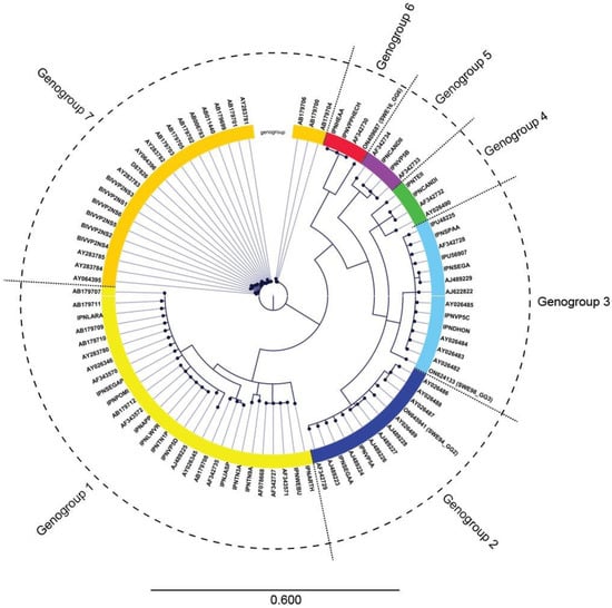 - Nishizawa, T.; Kinoshita, S.; Yoshimizu, M. An approach for genogrouping of Japanese isolates of aquabirnaviruses in a new genogroup, VII, based on the VP2/NS junction region. J. Gen. Virol. 2005, 86 Pt 7, 1973–1978. [Google Scholar] [CrossRef]
