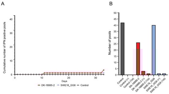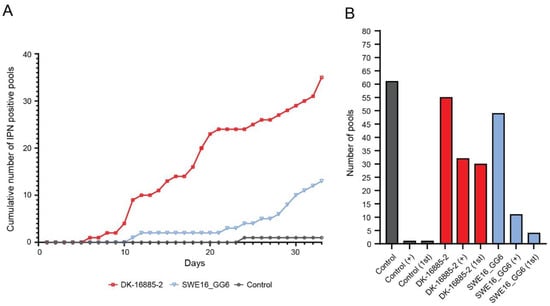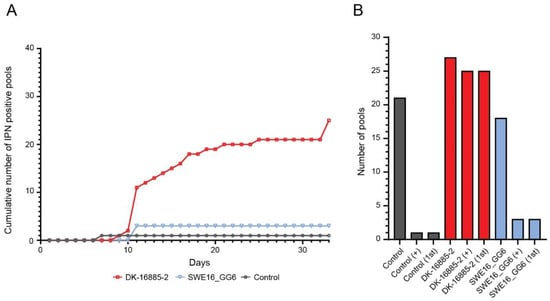 Investigation of the pathogenicity of IPNV in rainbow trout. (A) the cumulative number of IPNV positive pools by cell culture for the DK-16885-2 (red) and the SWE16_GG6- (blue) isolate. (B) the total number of pools tested and the number of pools positive for IPNV. Pools positive for IPNV before subculturing are indicated by “1st”, and total number of positive pools are indicated by “+”. Control samples are showed in grey; DK-16885-2 isolate in red, and Swedish isolate in blue.