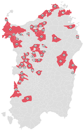 Map of Sardinia with sample collection sites for Babesia/Theileria molecular detection in mammals between 2020–2021.