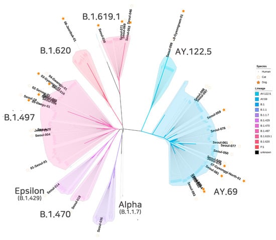 In total, eight Pango lineages (B.1.1.7 (Alpha variant), B.1.429 (Epsilon variant), B.1.470, B.1.497, B.1.620, B.1.619.1, AY.69 (Delta variant), and AY.122.5 (Delta variant)) were identified in this study. Dominant lineages were AY.69 (Delta variant; 37.5%), B.1.497 (35.0%), and B.1.619.1 (12.5%). In cats, B.1.497 was the most detected lineage (40.0%), followed by AY.69 (Delta variant; 36.0%). In dogs, AY.69 (Delta variant) was the most detected lineage (40.0%), followed by B.1.497 (26.7%).