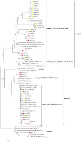 A phylogenetic tree based on the ORF5 nucleotide sequences was generated using the neighbor-joining method with 1000 bootstrap replicates in MEGA X software. Red and yellow prisms represented PRRSV isolates collected from Hunan and Hebei provinces, respectively.