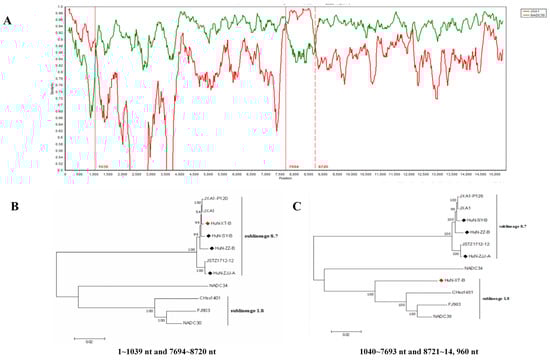 Genome-wide recombinant analysis of PRRSV strain HuN-XT-B predicted by the SimPlot v3.5 software. (A) the potential recombination breakpoints of HuN-XT-B were shown as red lines, compared with the parental PRRSV strains (NADC30 and JXA1). (B) Phylogenetic tree based on the nucleotide recombination regions (1–1039 nt and 7694–8720 nt). (C) Phylogenetic tree based on the nucleotide recombination regions (1040–7693 nt and 8721–14,960 nt). Red prism represented the recombinant PRRSV isolate, black prisms represented the other PRRSV strains isolated in the present study.