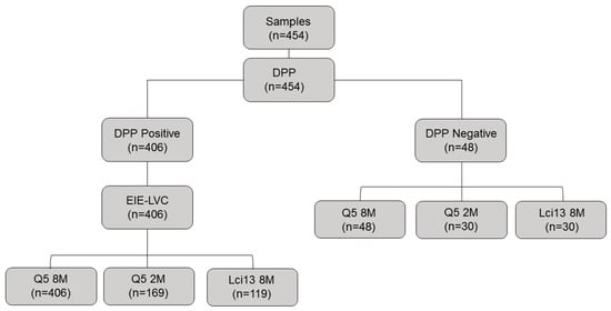 The tests DPP and the EIE-LVC, both produced at Bio-Manguinhos (Fiocruz, Rio de Janeiro, Brazil) for CVL diagnosis, were used as recommended by the manufacturer. The ELISA assays with the recombinant Q5 and Lci13 were performed essentially as described previously [], using 600 ηg per well of the recombinant proteins. For the assays, the wells were incubated with the canine sera at dilutions of 1:900 (for Q5) or 1:200 (for Lci13), using as the second antibody the peroxidase-conjugated goat anti-dog IgG (diluted 1:10,000, from Sigma Aldrich (St. Louis, MO, USA), catalog no. A6792 (Q5 2M and Lci13) and diluted 1:1200, from Jackson Immuno Research 304-005-003 for Q5 8M). For the ELISA assays with recombinant proteins, sera were used in triplicates. Sera dilutions were defined using a standardization curve ranging from 1:100 to 1:900. To assess the clinical performance of the assay, the Q5 was evaluated in retrospective clinical specimens to compare its diagnostic capability with reference methods. A total of 454 sera were tested with DPP, with all DPP-positive sera also tested subsequently with the EIE-LVC assay. Figure 1 details the number of samples tested with each of the ELISA assays evaluated here.
