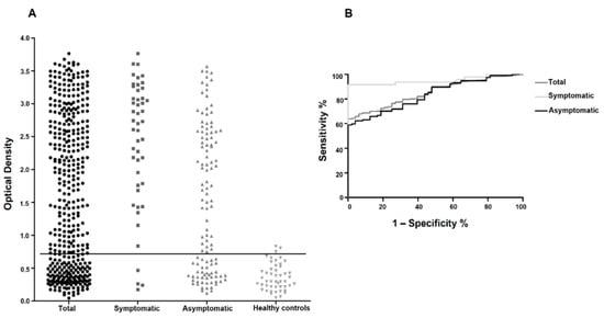Evaluation of the recombinant Q5-8M with a large set of sera from VL-positive dogs. (A) ELISA results with the recombinant Q5 from the testing of the 406 DPP-positive sera, as well as the symptomatic (48 sera), asymptomatic (117 sera) and healthy-control groups (48 sera). (B) ROC curves for the three DPP-positive groups generated with the results shown in (A).
