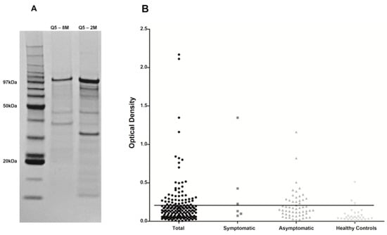 Comparative evaluation of a second batch of the Q5 chimeric protein. (A) SDS-PAGE gel showing the different protein purifications of Q5 using 8 M and 2 M urea. (B) ELISA results with the recombinant Q5 purified with 2 M urea and tested with 169 DPP-positive (Total), Symptomatic and Asymptomatic sera as well 30 control sera (Healthy Controls).