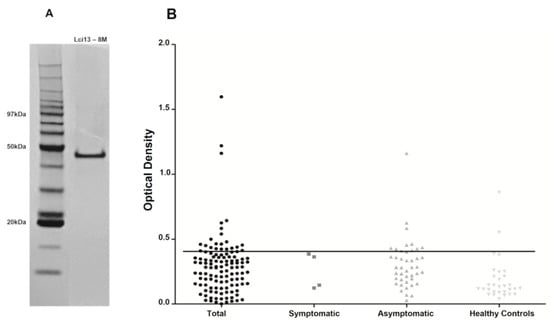 Evaluation of the Lci13 recombinant protein for the CVL diagnosis. (A) SDS-PAGE gel showing the purified recombinant Lci13 used for the ELISA assays. (B) ELISA results with the selected 119 DPP positive (Total), Symptomatic, and Asymptomatic sera as well as the 30 control sera (Healthy Controls).
