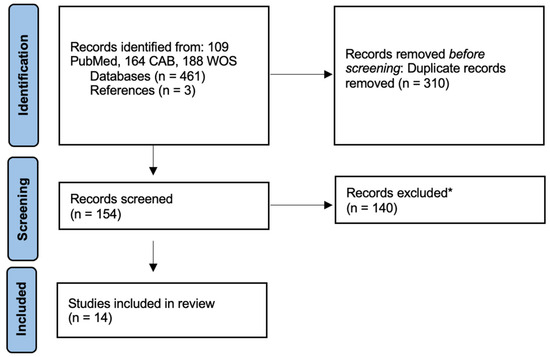 Our search identified a total of 460 records across three databases. After screening, 14 articles were included in this review (Figure 1) [15,16,17,18,19,20,21,22,23,24,25,26,27,28].