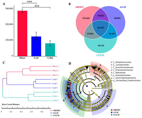 Gut microbiota gene annotation and composition differences in giant pandas feeding on different parts of food. (A) Bar plot showing the differential abundance of unigenes among the three groups, *** p < 0.001. (B) A Venn diagram is employed to visually represent the distinct and overlapping unigenes across the various groups. (C) Clustering tree based on Bray-Curtis distance. (D) Phylogenetic tree of differentially abundant species. The concentric circles depict the taxonomic hierarchy, ranging from phylum to species. Each individual circle at each taxonomic level represents a classification at that level, with the size of the circle reflecting its relative abundance. Species that do not exhibit significant differences are denoted by yellow coloration, while differentially abundant species biomarkers are color-coded based on their respective groups, indicated by an LDA score > 4.
