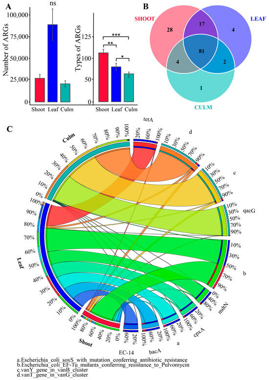 After annotation with the CARD database, it was found that the gut microbiota of giant pandas feeding on bamboo leaves had the highest number of ARGs, but the differences among the three groups were not statistically significant (Figure 2A). Furthermore, a total of 137 antibiotic resistance genes (ARGs) were identified, with 130 ARGs in the shoot group, 104 ARGs in the leaf group, and 88 ARGs in the culm group. Among these, 81 ARGs were shared among the three groups, while 28 ARGs were unique to the shoot group, 4 ARGs were unique to the leaf group, and 1 ARG was unique to the culm group (Figure 2B). Each group exhibited unique ARG compositions, with the shoot group having over 60% abundance of E. coli EF-Tu mutants conferring resistance to Pulvomycin. The leaf group showed a more balanced distribution of ARGs, including E. coli EF-Tu mutants conferring resistance to Pulvomycin, tetA, mdtN, E. coli soxS with mutation conferring antibiotic resistance, cpxA, bacA, and EC-14. The culm group had three main ARGs, namely vanT gene in vanG cluster, vanY gene in vanB cluster, and qacG. The 137 ARGs were classified into 47 drug classes, with glycopeptide antibiotic, fluoroquinolone antibiotic, tetracycline antibiotic, macrolide antibiotic, and cephalosporin being the most prominent classes in terms of proportion.