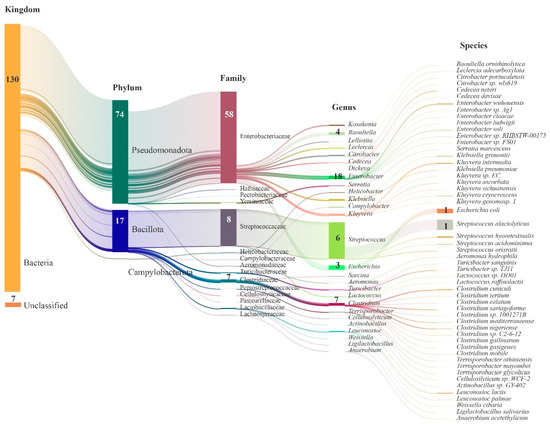 Sankey diagram illustrating the taxonomic classification of species identified with ARGs in the gut microbiota of giant pandas. The length of each column represents the relative abundance of the respective microbial group. The numbers within the columns indicate the count of ARGs.