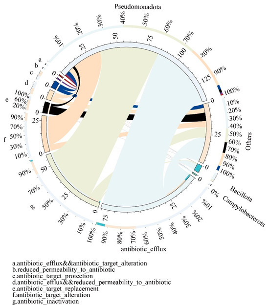 Furthermore, the attribution of ARGs in the gut microbiota of captive giant pandas can be categorized into 10 different resistance mechanisms (RMs). The most predominant RMs include antibiotic efflux, antibiotic inactivation, and antibiotic target alteration, which collectively account for an average relative abundance of over 70% and are primarily attributed to the phylum Pseudomonadota. A smaller portion of these RMs is attributed to the phylum Bacillota (Figure 4).