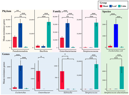 To analyze the differences in gut microbiota composition associated with annotated ARGs among different groups, we performed statistical analysis using the most important microbial resistance gene counts at each taxonomic level. At the phylum level, the number of annotated resistance genes in Pseudomonadota was significantly higher during the bamboo leaf consumption period compared to the shoot and culm consumption periods. Bacillota showed significantly higher resistance gene counts in the culm group compared to the other two groups. At the family level, Enterobacteriaceae dominated in the bamboo leaf group, being the major component of Pseudomonadota. Streptococcaceae showed significantly higher counts in the culm group compared to the other two groups. Among the genera, Streptococcus, which is the predominant member of Bacillota, exhibited a significantly higher abundance in the culm group compared to the other two groups. Escherichia showed the significantly higher counts in the bamboo leaf group. Enterobacter and Klebsiella exhibited the highest counts in the shoot group. However, there were no significant differences observed in the levels of annotated resistance genes associated with Clostridiaceae and Clostridium among three groups, which had relatively higher abundances. At the species level, E. coli was the most important component of Escherichia and showed significantly higher counts in the bamboo leaf group. Streptococcus alactolyticus exhibited the highest counts in the culm group (Figure 5).