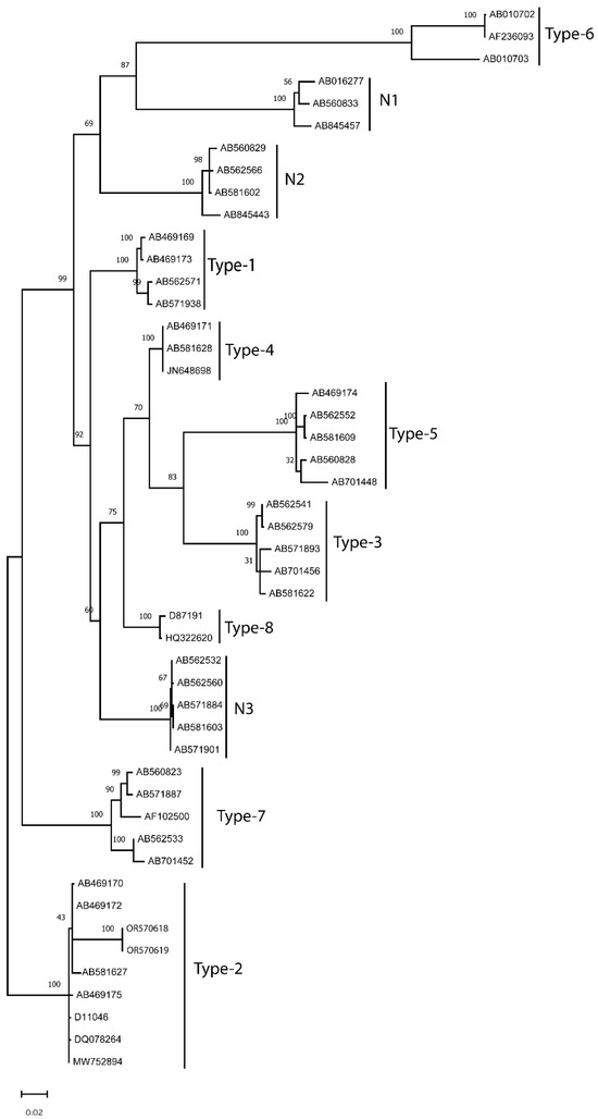 The MPSP serves as an antigenic marker for Theileria spp. and is widely employed for genotyping the 11 distinct T. orientalis groups [1,17]. The 739–760 bp nucleotide sequences of the MPSP gene, representing these 11 T. orientalis genotypes, were concatenated and aligned using CLUSTALW. Subsequently, a maximum likelihood phylogenetic tree was constructed. The sequences from T. orientalis identified in this study (ALP-1, ALP-2) displayed a 100% match with those from recognized T. orientalis Ikeda strains (Figure 1). Furthermore, they exhibited similarities ranging from 76% to 88% with other T. orientalis genotypes (Type 1: 86–87%; Type-3: 82–83%; Type-4: 87%; Type-5: 80–81%; Type-6: 76%; Type 7: 88%; Type-8: 86%; N1: 79%; N2: 83–84%; N3: 86–87%) (Figure 1). Although the internal segment of the small subunit gene was not amplified in the Theileria-positive samples in this study, the phylogenetic trees, based on the long MPSP fragment, unequivocally confirmed the presence of T. orientalis Ikeda DNA in two cattle from Alabama.