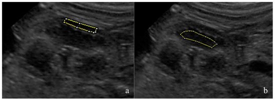 The fetal kidneys of the three most caudal fetuses in both uterine horns were observed and one sonogram of the most superficial kidney was obtained. The renal sonograms were collected using a longitudinal scan, showing the fetal kidney at its maximum length and with an evident cortico-medullary distinction. The renal sonograms were saved in an 8-bit DICOM format and analyzed using dedicated freeware software, Fiji Image J (Image J 1.51h, Java 1.6 0_24 64 bit, National Institute of Health, 9000 Rockville Pike, Bethesda, Maryland 20892 USA). The mean gray level (MGL) and standard deviation (SD) were measured on the manually drawn areas as regions of interest (ROIs). The ROIs were drawn avoiding the renal poles and artifacts [25,26]. For each image, one area was selected in the renal cortex and another in the medullary region (Figure 1). The MGL is the mean echogenicity of the considered area [27], and it was defined as the ratio between the sum of the intensity of the pixels and the number of pixels present in that area. SD is the standard deviation of the intensity of the pixels contained in the ROI, and it estimates the homogeneity of the pixels in the considered area [27]. The cortical MGL (C-MGL), cortical SD (C-SD), medullary MGL (M-MGL) and medullary SD (M-SD) were assessed. The cortical/medullary ratio (C/M) was also calculated using the obtained MGL and SD values.