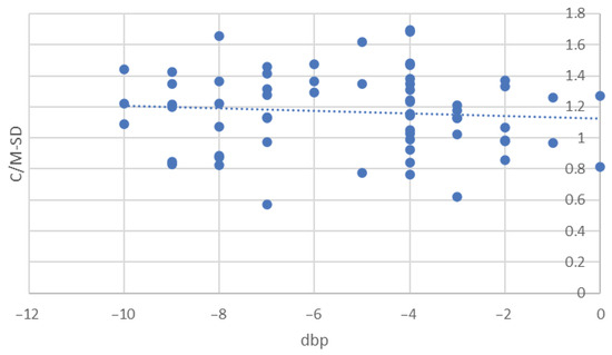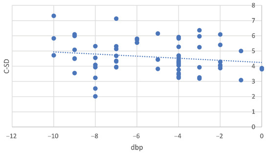 A total of 126 measurements (n = 63 for both the cortical and medullary regions) were acquired from 29 fetuses under examination. There were 30 renal sonograms acquired during the first time point (time I) and 33 during the second time point (time II). All collected data exhibited a normal distribution. The C-MGL was found to be unaffected by dbp and maternal and litter size (p = 0.6, p = 0.3 and p = 0.4, respectively). Conversely, the C-SD was influenced by dbp and exhibited a decrease as delivery approached (b = 0.23 ± 0.06, p < 0.001) (Figure 2), while it remained uninfluenced by bitch size and litter size (p = 0.1 and p = 0.4, respectively).