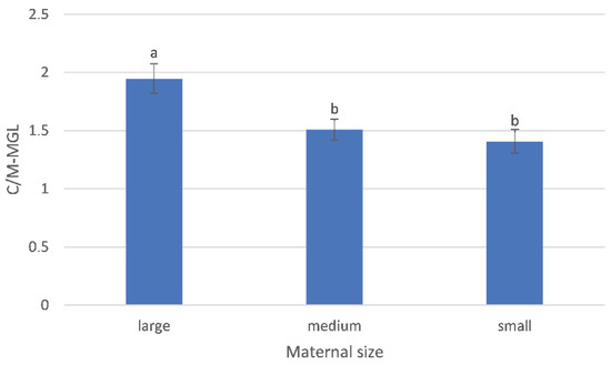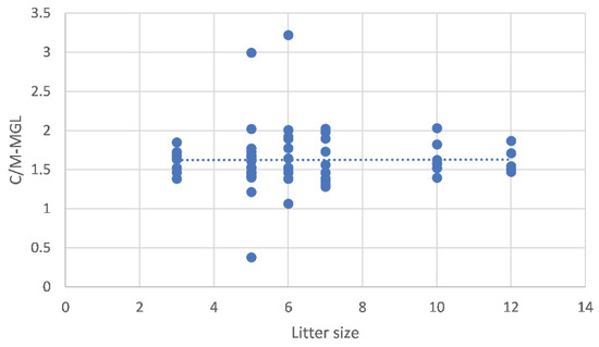 The C/M-MGL was influenced by litter size, decreasing as litter size increases (b = −0.08 ± 0.03, p = 0.018) (Figure 4) and by maternal size (p = 0.01) (Figure 5), with different values between large-sized (1.95 ± 0.13) and medium-sized (1.51 ± 0.09, p = 0.016) and between large- and small-sized bitches (1.41 ± 0.10, p = 0.027). The C/M-MGL was not affected by dbp (p = 0.8). A correlation was found between maternal body weight and litter size (p < 0.0001) with a Pearson correlation coefficient of 84.8% (r = 0.848).