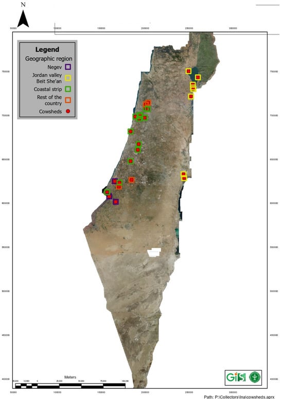 The geographic distribution of infected herds participating in the study throughout Israel.