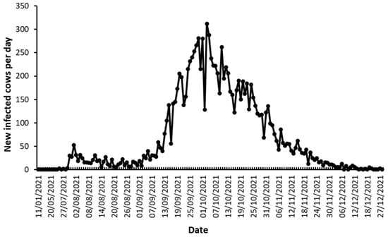 This study used retrospective data from the Israeli herd book (Israel Cattle Breeders Association). Farmers routinely report data on every BEF event to the Farm Herd Management Program (NOA). Retrospective data of reported BEF events were analyzed to present the accumulation and distribution of the number of new clinically diagnosed cases per day during the 2021 outbreak.