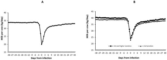 Changes in daily milk yield during the BEF outbreak. (A) Daily changes in primiparous cows. (B) Daily changes in multiparous cows.
