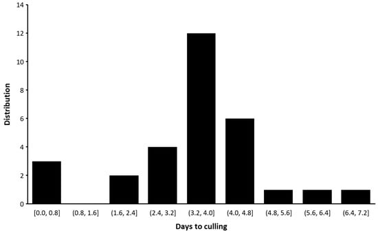 ii. To accurately evaluate culling rates due to BEF infection, only cows culled within ten days from their diagnosis date were included. The distribution of these days from the diagnosis date until culling was determined according to the farmers’ reports to the Farm Herd Management Program (NOA).