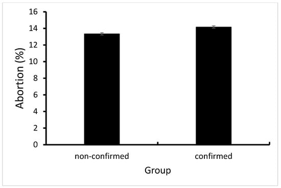 Abortion rates did not differ between cows in which BEF was not confirmed and cows in which BEF was confirmed (13.3% vs. 14.15%, respectively; p-value = 0.3744; Figure 5).