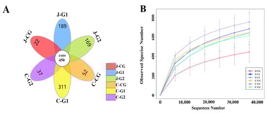 (A) OTU petal diagram of jejunum and cecum contents in groups with different protein levels. (B) OTU dilution curves of jejunum and cecum contents in groups with different protein levels. J-CG is the content of the jejunum of the CG, J-G1 is the content of the jejunum of G1, and J-G2 is the content of the jejunum of group G2; C-CG is the content of the cecum of the CG, C-G1 is the content of the cecum of G1, and C-G2 is the content of the cecum of G2. These designations also apply to the following figure.