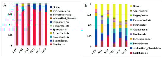 Firmicutes, Bacteroidetes, and Proteobacteria were the main predominant phyla of the jejunum and cecum of fattening pigs, as these phyla accounted for more than 95.0% of the total flora (Figure 2A; Supplementary Materials, Table S1). In the jejunum, the proportions of Firmicutes and Bacteroidetes in the CG, G1, and G2 were 28.82, 25.14, and 45.92. The next most abundant phyla were Actinobacteria, Spirochaetes, Euryarchaeota, and Cyanobacteria. Compared with the CG, the relative abundance of Firmicutes in G1 significantly decreased by 13.03% (p < 0.05), and the relative abundance of Proteobacteria significantly increased by 332.06% (p < 0.05), whereas the relative abundance of Proteobacteria in G2 was significantly lower than in the CG (p > 0.05). The relative abundance of the phylum Gastroarchaea was significantly increased in G1 relative to the CG (p < 0.05); the relative abundance of Gastroarchaea was also elevated in G2 relative to the CG (p > 0.05). The relative abundances of other bacterial phyla in G1 and G2 were significantly increased relative to the CG (p < 0.05). In the cecum, the relative abundances of Firmicutes in G1 and G2 were reduced by 2.92% (p > 0.05) and 5.75% (p > 0.05). The relative abundances of Bacteroides in G1 and G2 increased by 7.20% (p > 0.05) and 31.14% (p > 0.05). Dietary protein levels could affect the diversity and abundance of jejunum and cecum microorganisms in finishing pigs at the phylum level.