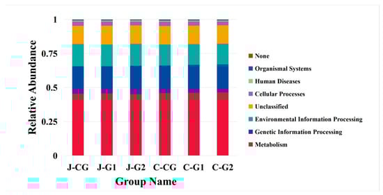 The functional genes of microorganisms in the jejunum and cecum of Hexi pigs were enriched in 10 main KEGG pathways under different protein levels of diet, as shown in Figure 3. Most of the genes were enriched in pathways for metabolism. The difference in gene functional pathways between jejunum and cecal microbiota was mainly manifested in differences in metabolic pathways (Supplementary Materials, Figure S1). There was no significant difference in the KEGG pathway of jejunal microbiota genes. On the contrary, there were significant differences in the KEGG gene enrichment pathway among groups in the cecum (p < 0.05), which were mainly manifested by significant differences between the CG and G2 in the human disease pathway (p < 0.05). At different dietary protein levels, the annotation abundance of other gene pathways is basically the same and there is no significant difference.