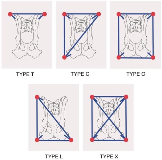 Different types of interconnections between hemipelves used as external fixation in the present study, as well as a classification proposal. Type T: a single bar interconnects the pins located on both iliac wings. Type C: the bars connect the pins on the iliac wing and ischiatic tuberosity of one hemipelvis to each other, and with the pin located on the wing of the contralateral ilium. Type O: the bars interconnect the pins of each hemipelvis around the perimeter. Type L: the bars connect the pins of one hemipelvis to each other and with the pin located on the contralateral ischial tuberosity. Type X: the bars interconnect the pins around the perimeter and with a cross-connection between the pins located at the vertices of the quadrilateral.