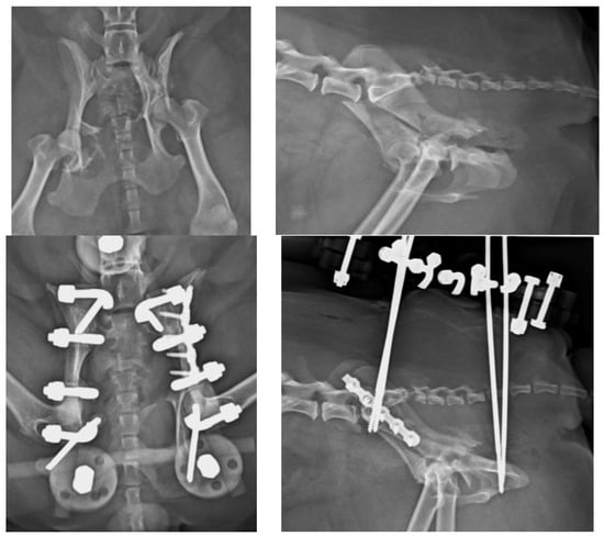 Pelvic fractures in small animals account for 25% of those diagnosed in daily clinical practice [,]. Most fractures in dogs are caused by traffic accidents, falls, or blows. Pathological fractures are less frequent []. Conservative treatment is an option that, although some studies have reported successful outcomes [], often leads to inadequate reduction and needs a long recovery time []. Surgical treatment is generally considered the standard choice in most cases, providing a shorter recovery time, faster healing, a reduced incidence of diseases related to the stenosis of the pelvic canal, and a better functional outcome [].
