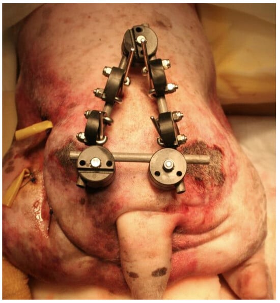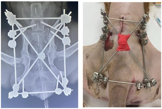 In the veterinary literature, some studies have been published in which EF was used for the treatment of pelvic fractures. The main characteristics of this technique are safety, ease of application, and patient compliance, generally providing a good outcome with a low rate of complications [,,]. The most frequent complications encountered were loosening of the frame and local infection at the pin sites [,].