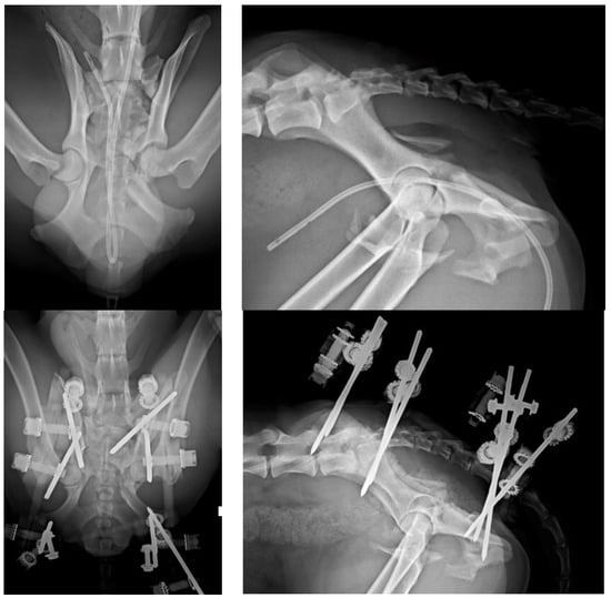 There are few studies in the literature addressing EF applied to pelvic fractures in small animals [], in opposition to human medicine, where its use is common in unstable pelvic fractures, especially in the early stages of treatment [,], due to its known biomechanical properties and its peculiar characteristics [,,,,]. The modularity of the system and its simple application, either as a temporary or definitive method for fracture resolution, provides speed as a surgical technique, i.e., offering notable advantages in critical patients []. These fixators can be radiolucent, thus greatly facilitating the evaluation of healing []. Radiographic rechecks are easier, avoiding the need for oblique projections as usual with standard metallic EF frames (Figure 4 and Figure 5). In addition, in patients treated with fluoroscopic-assisted techniques, the interference during the procedure is considerably reduced, allowing reduction maneuvers to be performed much more easily. However, a clear downside of the use of fluoroscopy is the radiation exposure, which may be considerable in long surgical procedures. Nevertheless, in our opinion, a highly experienced surgeon can reduce considerably the amount of radiation needed.