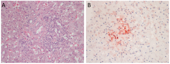 When retesting all the three specimens with a qualitative PCR protocol [1], both liver and serum samples, collected in November 2021, were positive, whilst the serum collected in February 2022, 3 months after the initial diagnosis, tested negative for DCH. All the specimens were negative for feline calicivirus, feline herpesvirus type 1, feline panleukopenia parvovirus, feline coronavirus, and feline retroviruses, thus ruling out co-infections [21,22,23,24,25,26]. The immunohistochemistry (IHC) assay, performed on the liver biopsy by using a rabbit polyclonal anti-HBV core antigen (HBcAg) (Thermo Fisher Scientific, Waltham, MA, USA), as previously described [11,12], revealed cytoplasmic immunoreactivity with focal strong intensity (Figure 2B), confirming the presence of DCHcAg.