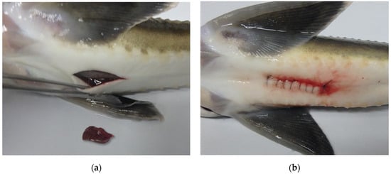 In this context, sturgeon is a suitable fish species for conducting surgical experiments due to its characteristics of harvest and industrial significance []. Sturgeons have been subjected to abdominal laparoscopic surgery for sex identification, as they have a long reproductive cycle and low spawning rates, making it difficult to distinguish between males and females []. Sturgeon, one of the most widely cultivated freshwater fish, is often slaughtered for its fine food ingredients such as caviar and/or its meat []. As the sturgeon takes a long time to reach maturity and has a low spawning rate, the roe is extracted from mature fish through a caesarian section, and then it is stitched back together to enable further spawning []. Additionally, rearing sturgeon until they reach marketable size in a short period is challenging, and satisfying the demand for sturgeon food ingredients within a short period is difficult []. In laparotomy and laparoscopic operations, many sturgeons have died due to infectious diseases, shock, unstable homeostasis, or accidents []. Therefore, it is crucial to maintain the physiological activity of the fish before performing any surgical procedures [].