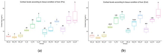 The cortisol levels according to liver condition: (a) cortisol levels before the start of the experiment; (b) cortisol levels at the end of the experiment; NC = negative control, C = control, HE = hepatectomy, LA = laparotomy, N = normal, FC = fatty change, AT = atrophy. Each box encapsulates the interquartile range, while the horizontal line within represents the median. The vertical lines extending from the box denote the maximum and minimum values. Additionally, individual data points, represented as dots, signify outliers in the dataset. The lowercase letters depicted in each graph signify inter-group statistical significance.