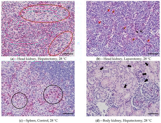 Notably, in the head kidney, the hyperplasia of the reticuloendothelial system (RES) was observed in individuals subjected to hepatectomy and laparotomy, and this was more pronounced in the high-temperature group (Figure 4a). Moreover, an increased prevalence of actively dividing hematopoietic cells was observed in the high-temperature groups relative to the 18 °C groups (Figure 4b). In addition, immature erythrocytes (reticulocytes; irregular and eosinophilic cytoplasm was observed, differing from normal erythrocytes) were observed in the spleen of the high-temperature group, including the high-temperature control (Figure 4c). In the body kidney of the high-temperature group, including the high-temperature control, significant expansion (edema lesions) of the proximal tubule was observed (Figure 4d). In the control group, the liver displayed normal conditions, whereas the low and high-temperature groups exhibited fatty change and atrophy (Figure 4e). Furthermore, the groups that underwent surgical procedures demonstrated the infiltration of inflammatory cells (including eosinophilic granuloma cells, EGC) and an increase in melanomacrophage centers (MMCs) (Figure 4f). Obviously, leukocyte infiltration at the suture site was observed in groups that underwent hepatectomy or laparotomy (Figure 4g,h); however, in the high-temperature group, the occurrence of collagen bundles was also observed (Figure 4h). Additionally, it was noteworthy that, within the group subjected to surgical procedures, the group at 28 °C, characterized by elevated temperature, exhibited a distinctive pattern. In contrast to the 18 °C groups, where predominantly inflammatory cell infiltration in the lobular architecture of adipose tissue under the wounded area was noted (Figure 4g), the 28 °C groups displayed the presence of collagen bundles within the lobules of the subcutaneous layer of adipose tissue (Figure 4h).