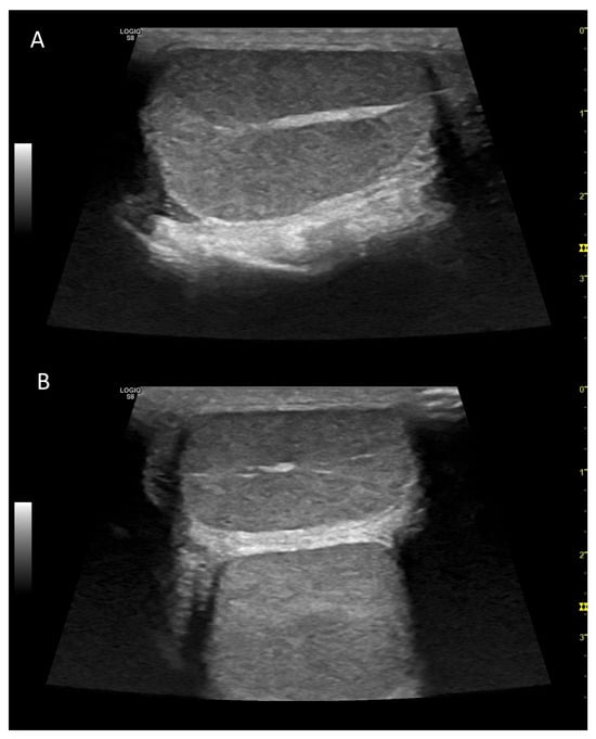 In prepubertal dogs, the testes tend to have a more hypoechoic echogenicity compared to adult dogs, and the mediastinum testis can be easily identified []. Typically, there are no noticeable differences in echogenicity between the right and left testis [,].