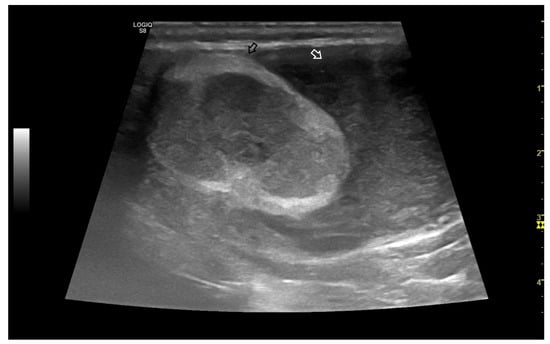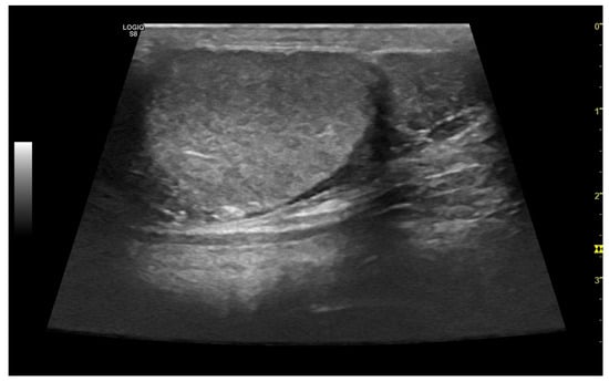 Ultrasonography is a sensitive diagnostic tool for cryptorchidism, used to locate and evaluate undescended testicle(s), which may be located in the abdominal cavity (sensitivity of 97.7%), inguinal canal (sensitivity of 100%), or in an ectopic subcutaneous location between the superficial inguinal ring and the scrotum []. This method facilitates the location of retained testes before surgical exploration or laparoscopy []. Cryptorchid testes are typically smaller in size, and the testicular parenchyma can often be detected by the presence of the hyperechoic mediastinum testis. Retained testicles may undergo neoplastic transformation [], and they are usually located based on their increased size and abnormal architecture (Figure 3). They appear as masses with mixed echogenicity and varying diameters, often situated in abdominal region [].