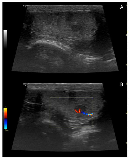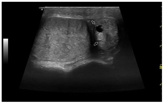 Orchitis, as inflammation of the testis, can occur acutely or chronically. Acute orchitis may present with variable ultrasonographic characteristics, ranging from irregular and poorly defined anechoic areas to a diffuse patchy hypoechoic echo pattern, and focal abscessation may be evident [,,]. Typically, the testis and epididymis enlarge, and fluid may accumulate between the visceral and parietal tunic within the scrotum [,,,]. Chronic orchitis is less obvious in terms of ultrasonographic features and may reveal hyperechoic or mixed echogenic parenchyma, often associated with a reduction in testicular size []. In the case of chronic progression of orchitis, abscess formation may occur, characterized by an irregular hyperechoic wall and anechoic to hypoechoic central contents [].